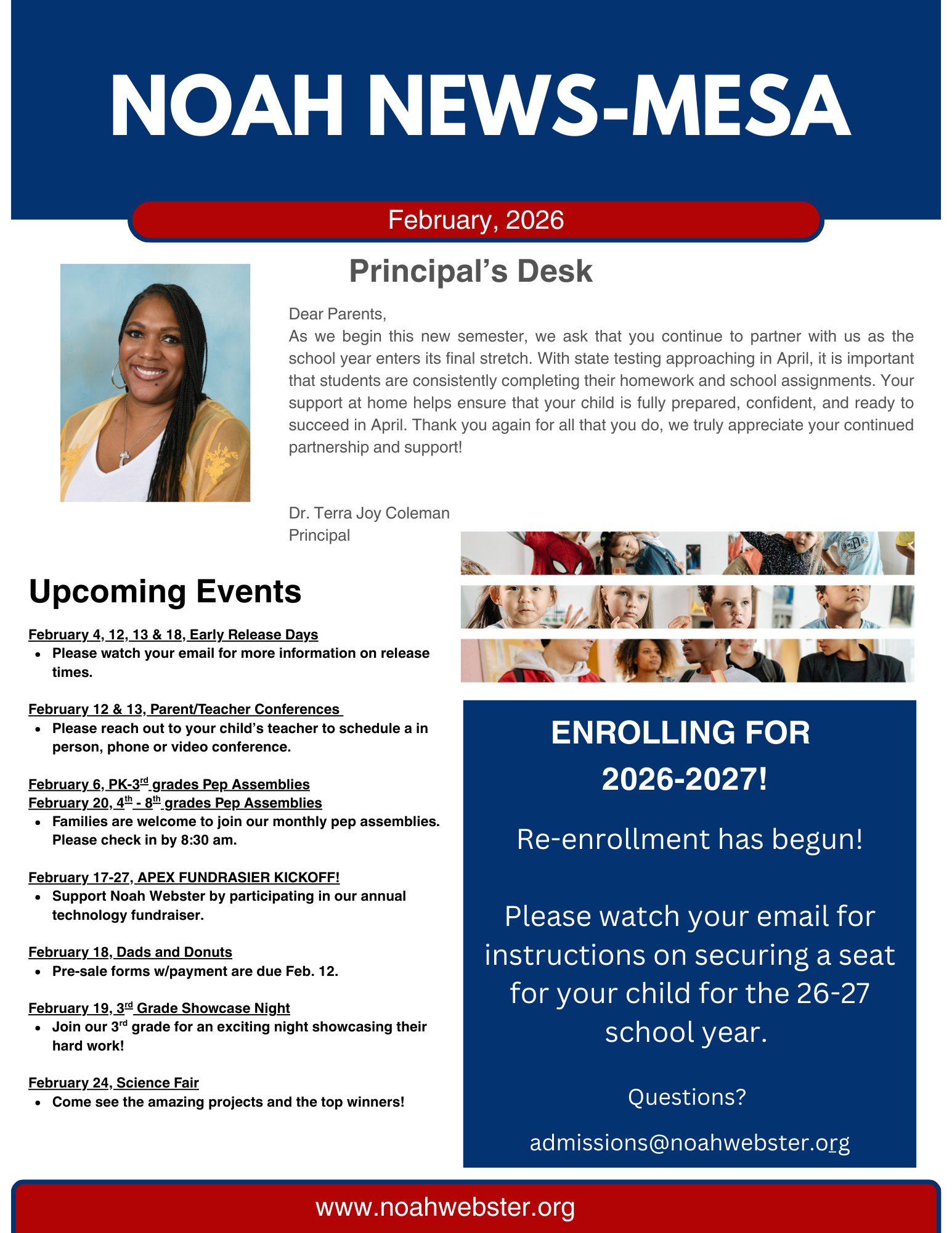MESA Noah News: February 2026 By Noah Webster|2026-02-02T09:42:25-07:00February 2nd, 2026|Mesa Campus, Whats Happening|0 Comments Share This Event, Choose Your Platform! FacebookXLinkedInEmail Related Posts Don’t Forget to Schedule! Don’t Forget to Schedule! PIMA Noah News: February 2026 PIMA Noah News: February 2026 PIMA: Get your Tickets for Dads & Donuts! PIMA: Get your Tickets for Dads & Donuts! MESA: Get your Tickets for Dads & Donuts! MESA: Get your Tickets for Dads & Donuts! SPIRIT WEEK is Here! 1/12/2026 – 1/16/2026 SPIRIT WEEK is Here! 1/12/2026 – 1/16/2026