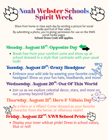 Spirit Week is Coming to Noah Webster! By Noah Webster|2025-08-14T16:13:50-07:00August 14th, 2025|Mesa Campus, Pima Campus, Whats Happening|0 Comments Share This Event, Choose Your Platform! FacebookXLinkedInEmail Related Posts PIMA Boo Fest is Coming! PIMA Boo Fest is Coming! MESA Boo Fest is Coming! MESA Boo Fest is Coming! Last Call for Cookie Dough! Last Call for Cookie Dough! PIMA Noah News: October 2025 PIMA Noah News: October 2025 MESA Noah News: October 2025 MESA Noah News: October 2025