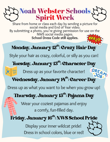 SPIRIT WEEK is Here! 1/12/2026 – 1/16/2026 By Noah Webster|2026-01-09T16:02:41-07:00January 9th, 2026|Mesa Campus, Pima Campus, Whats Happening|0 Comments Share This Event, Choose Your Platform! FacebookXLinkedInEmail Related Posts PIMA Noah News: January 2026 PIMA Noah News: January 2026 MESA Noah News: January 2026 MESA Noah News: January 2026 Reminder: After Care Closing at 3:00 pm on 12/19/2025 Reminder: After Care Closing at 3:00 pm on 12/19/2025 Jingle Grams are Here! Jingle Grams are Here! PIMA Noah News: December 2025 PIMA Noah News: December 2025